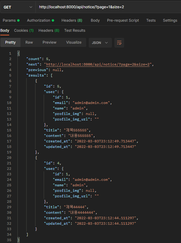 page는 1번, size는 2로 설정해서 호출해보면 아래와 같이